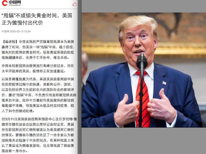 Aunque China y Estados Unidos tienen sentimientos diferentes, Estados Unidos pudo ’haber dejado de lado su arrogancia y aprender de la valiosa experiencia obtenida por China frente a la epidemia. Sin embargo, la Casa Blanca tratando de minimizar la amenaza de la epidemia y siempre señaló que ‘la epidemia no es terrible’ y que era "menos dañina para Estados Unidos".
